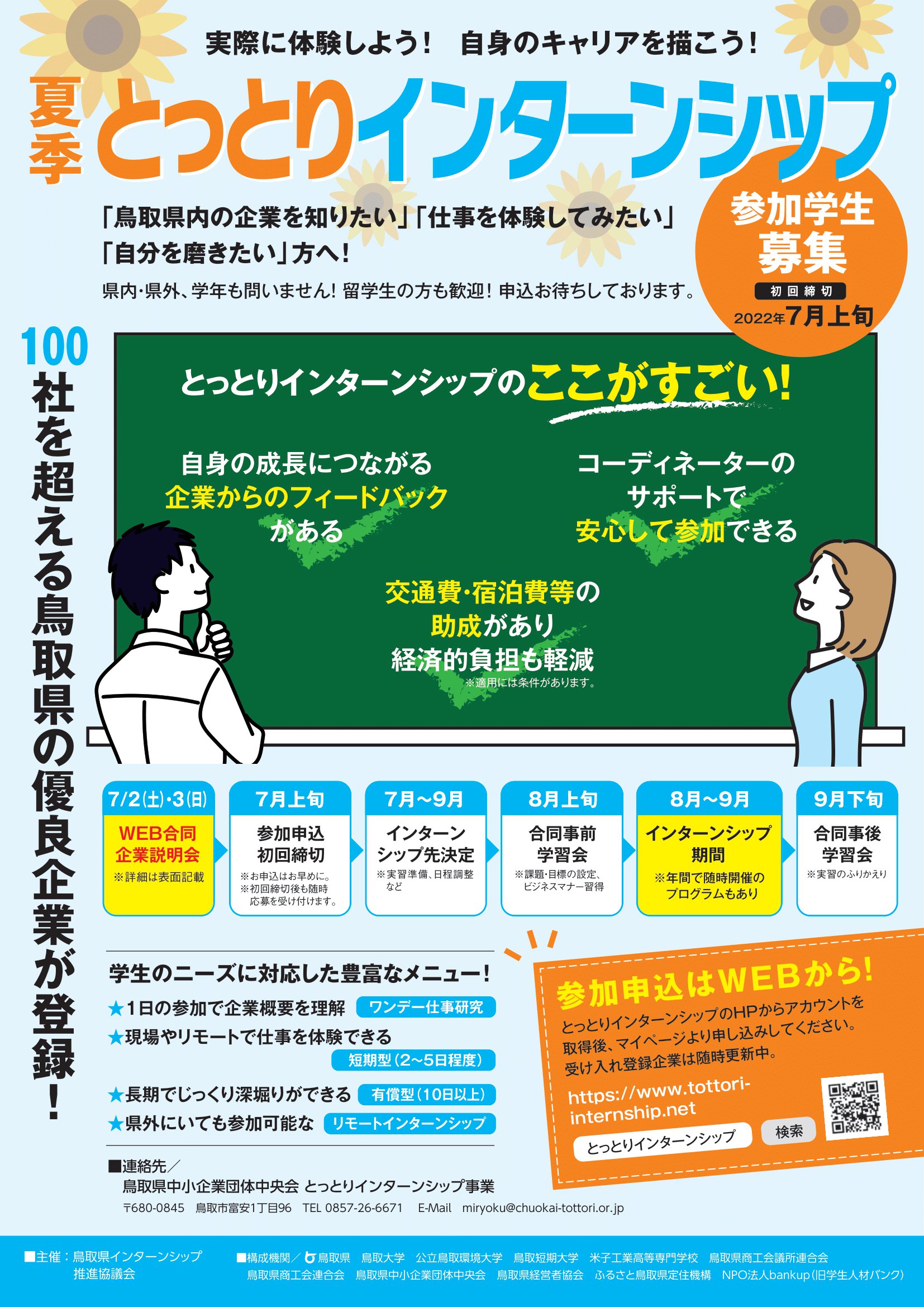 【学生のみなさまへ】2022夏季とっとりインターンシップのエントリーを受け付けています。