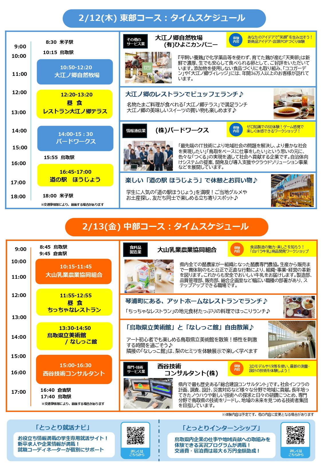 見学先企業:大江ノ郷自然牧場〔その他のサービス業〕体験内容:あなたのアイディアで”笑顔”を生み出そう!新商品アイディア・店頭POP作り体験 ▶ ランチ:大江ノ郷テラス ▶ ㈱バードワークス〔情報通信業〕体験内容:ゼロ知識でのSE体験!ゲーム感覚で楽しく体感できるワークショップ! ▶ 【散策】道の駅ほうじょう